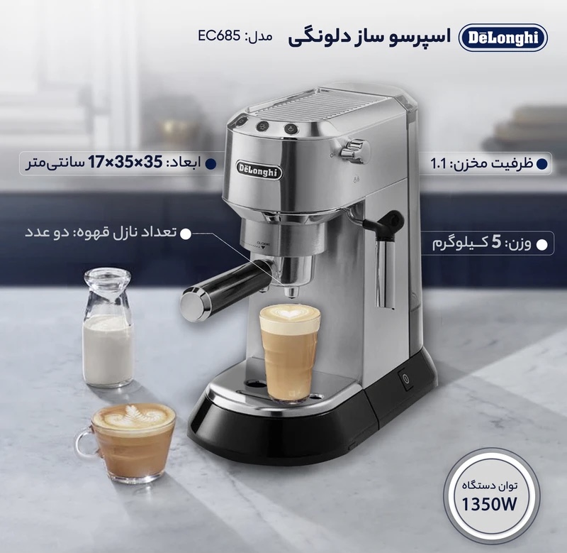 اسپرسوساز دلونگی مدل ec685 دلونگی محبوب ترین و پر فروش ترین اسپرسوساز خانگی بوده که دستگاهی چند کاره با امکانات حرفه ای، مدرن و قدرتمند است. این دستگاه با فشار بخار 15 بار و توان مصرفی 1350 وات قادر است تنها در چند دقیقه اسپرسو و قهوه ای با طعم فوق العاده را برای شما آماده کند. با دستگاه 685 دلونگی می توانید اسپرسو، کاپوچینو، لاته، ماکیاتو، آمریکانو، قهوه ترک،هات چاکلت را به راحتی تهیه و نوش جان کنید. .