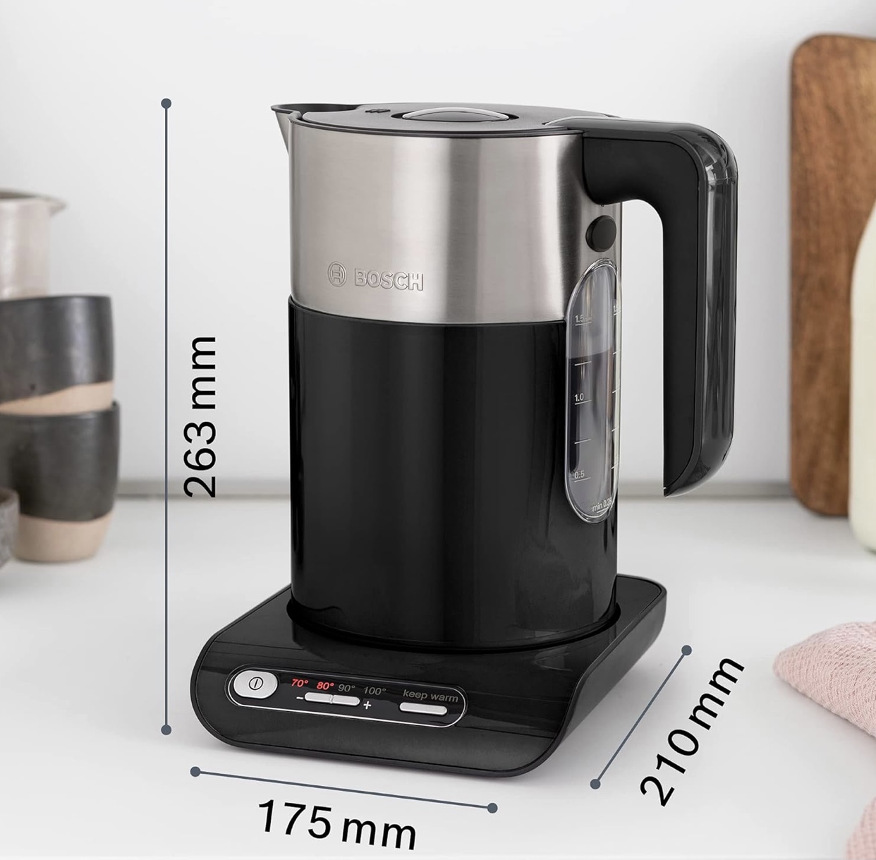 همچنین با توجه به اتصال کابل برق به پایه نگهدارنده و بی سیم بودن کتری، جابجایی و حمل آن به هر نقطه دلخواه شما امکانپذیر خواهد بود. به لطف تعبیه سیستم گرمایشی و المنتها در زیر کفیای از جنس استیل ضدزنگ، کتری برقی بوش مدل BOSCH TWK8613P به راحتی امکان شستشو را دارا است. لازم به ذکر است از آنجایی که در ساخت قسمتهایی از بدنه و دسته این کتری برقی از متریال پلاستیک استفاده شده است، عدم برخورداری این بخشها از ماده مضر شیمیایی BPA، سلامت کار با این دستگاه را متضمن شده و جای هیچ گونه نگرانی از این بابت باقی نمیگذارد.