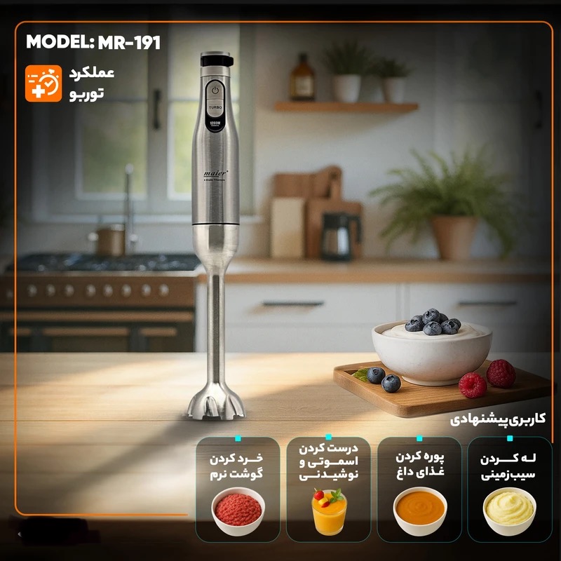 گوشت کوب برقی مایر مدل MR-191 با طراحی زیبا و عملکرد قوی، یک انتخاب عالی برای هر آشپزخانه است. توان 1200 وات، تیغههای استیل ضد زنگ و تنظیمات دو سرعته، به شما این امکان را میدهد که با سرعت و دقت بالا، مواد غذایی را خرد و مخلوط کنید. ویژگیهای کاربردی مانند عملکرد لحظهای (Pulse) و موتور کمصدا، به کارایی و راحتی استفاده از این دستگاه افزوده و تجربهای مثبت از استفاده آن را به شما ارائه میدهد. مقاومت در برابر زنگزدگی و خراشیدگی، همراه با طراحی ارگونومیک و دوام بالا، این دستگاه را به گزینهای ایدهآل برای استفاده روزمره تبدیل کرده است. با خرید گوشت کوب برقی مایر مدل MR-191، میتوانید از عملکرد بالا و کارایی عالی این دستگاه بهرهمند شوید و فرآیندهای آشپزی خود را سادهتر و سریعتر کنید.