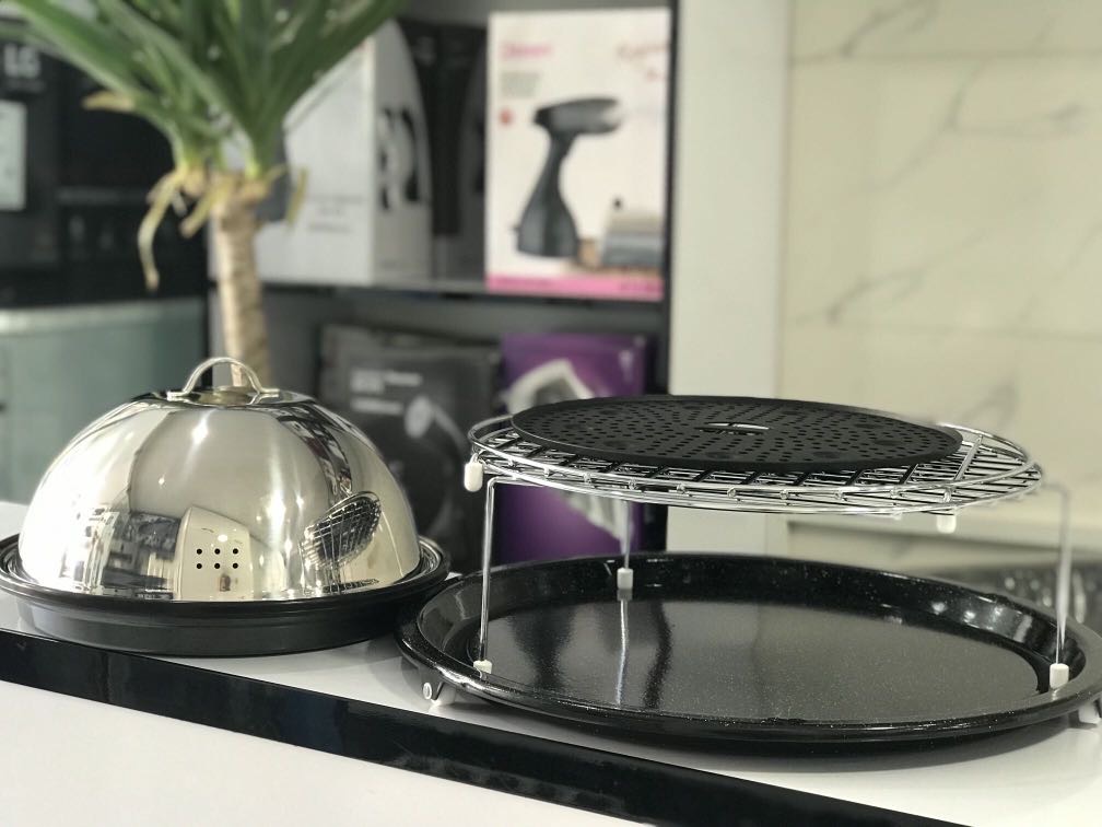 ۲عدد توری گریل ،سینی چرخان بزرگ،سینی چدن نچسب،ظرف مخصوص بخارپزstaem cook
